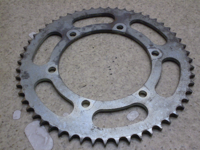 歯先の磨耗は少なく、欠け及び振れ等はありません。取り付け部も良好です。スプロケット外径227mm。内径120mm。取り付け穴ピッチ68mm。歯数55丁。
