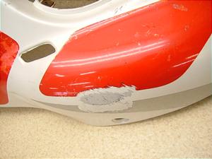 後方のツメが2ヶ所ひび割れしています。カウル中心部に削れあり。又、赤色のシールが色あせしています。大きなケズレ、欠けなく取り付け使用可能です。
