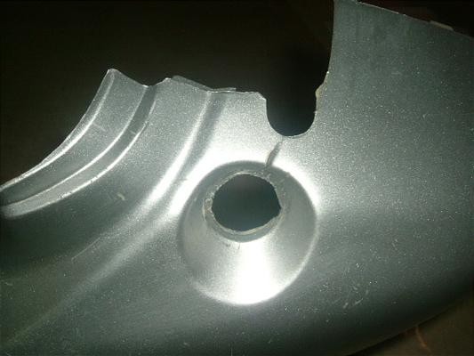 後期型用のブーンシルバーメタリックのシートカウルです。キーBOX取付部とオイルカバーの間がわれています。少補修で使用可能です。