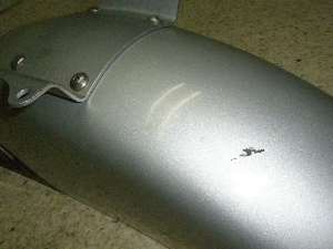 銀塗装のキレイなフェンダーで細かいスクラッチと色ハゲありますが転倒傷や割れなく色ツヤも良好です。