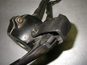 ブレーキレバーが少し下側に変形してますが、作動に問題無しで、色あせ目立ちます。スイッチの固着や断線無く、ホーンのスイッチは劣化あり。細かい色はげ有ります。