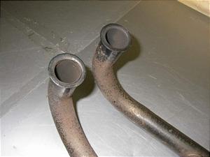 曲り、擦り傷、変形はありませんが全体に相当のサビがあります。外パイプ中間下に塩ビ類の溶け付着があります。十分使用出来ます。フランジ付。