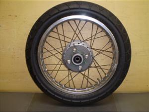 歪み、振れは有りません。ベアリングの固着も有りません。リムエッジに小キズが少し有りますが、リム部は点錆跡が少しあるだけで、ツヤのある綺麗なホイールです。スポークに錆が有ります。タイヤはIRC製で、サイズは110/90-18.残り山は7分程で良好です。