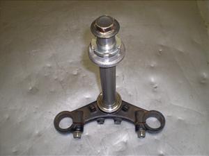 ブリッジ部に錆、汚れが少し有りますが、曲がり無く、しっかりしたパーツで、充分使用出来ます。上下ベアリング受け、キャップ、中ナット、トップナット付。シャフト径上23.5mm。下25.5mm。フォーク穴径30mm。