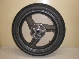 93年式。振れはありません。ペアリングに固着もありません。リムに小傷、少々あります。リムとキャストに錆、色はげは少ないです。サイズは17×4.00。チューブレスタイプ。エアキャップはなし。タイヤはIRC製。サイズは140/70-17。残り山6分ほどでひび割れありません。ハブに汚れ有ります。シャフト穴径17mm。スプロケット。ローターねじ付き。