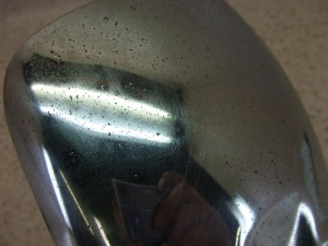 鉄製。少し錆や引っ掻きキズやスクラッチキズや数ヵ所、エクボや表側錆あります。少し変形してますがしっかりと付いていました。